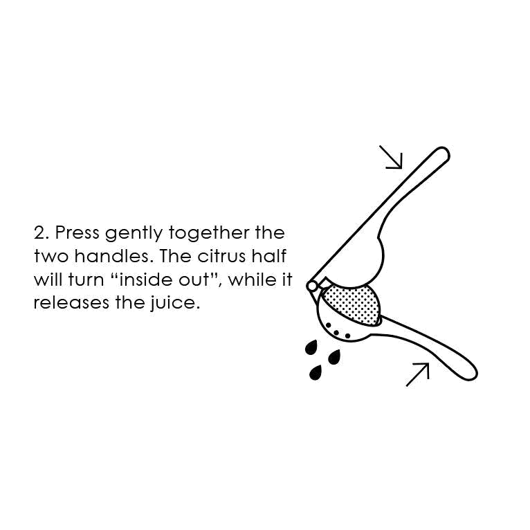 Usage: Cut a citrus fruit in half and place it cut side down in the press. The citrus fruit must not be larger than the press. Gently squeeze the two handles together so that the citrus fruit turns inside out. Remember to release the grip several times to avoid straining the handle and bending it.
