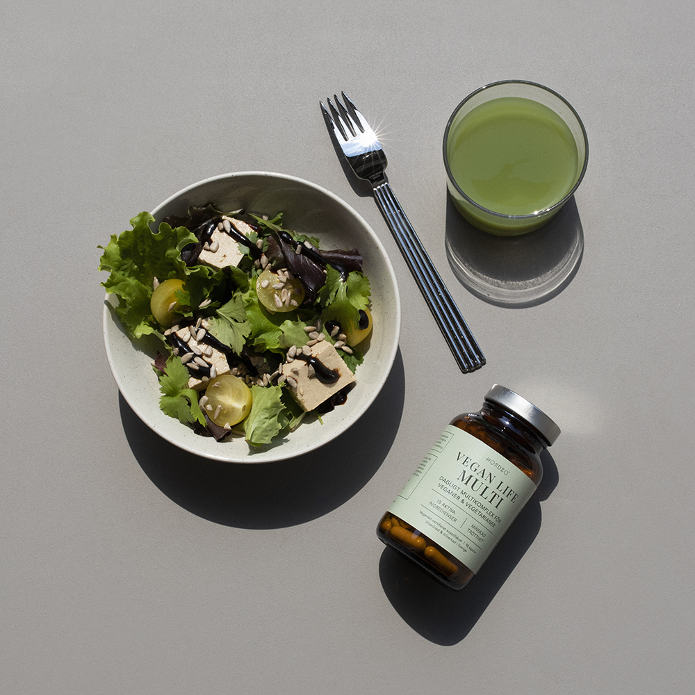 Vegan Life Multi is a daily supplement designed for vegans and vegetarians. The product contains fifteen active ingredients: panax ginseng, methylated B12, methylated folic acid, iron, magnesium, potassium, calcium, pantothenic acid, inositol, chromium, selenium, vitamin D3, biotin, beta-carotene and vitamin K2.