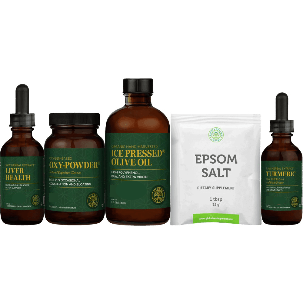 This cleanse from Global Healing Center includes five products: Oxy-Powder, Liver Health, Turmeric, Organic Extra Virgin Olive Oil, and Epsom Salt for internal use. Please read through the entire text carefully.