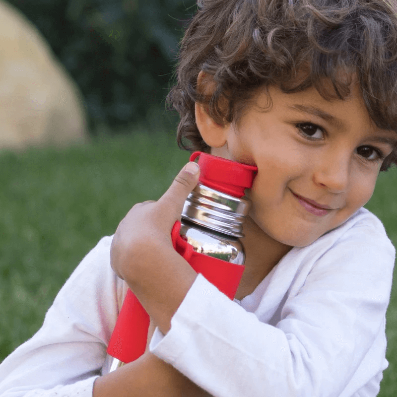 Flaskan har ett smart silikonhölje som ger ett bra grepp för händerna och som samtidigt hjälper till att skydda flaskan mot stötar. På sidan av silikonhöljet sitter en ring som man kan bära flaskan i. Som tillbehör att köpa till finns silikonsugrör, drickpip och olika dinappar. Vattenflaskan är lätt och skön att hålla i.