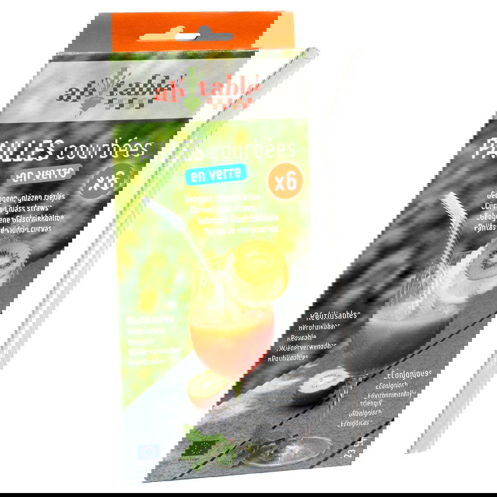 Ah! Table! glass straws are made of borosilicate glass and can be used for both cold and hot beverages. The straws have a diameter of 10 mm and are suitable for both thin and thick drinks like water or smoothies. These particular straws are 23 cm long and have a bent shape. A smart and handy cleaning brush for the straws is included. The straws don't absorb or release any flavors.