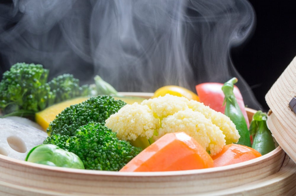 En dampende kurv fylt med forskjellige grønnsaker, inkludert brokkoli, blomkål og gulrøtter.