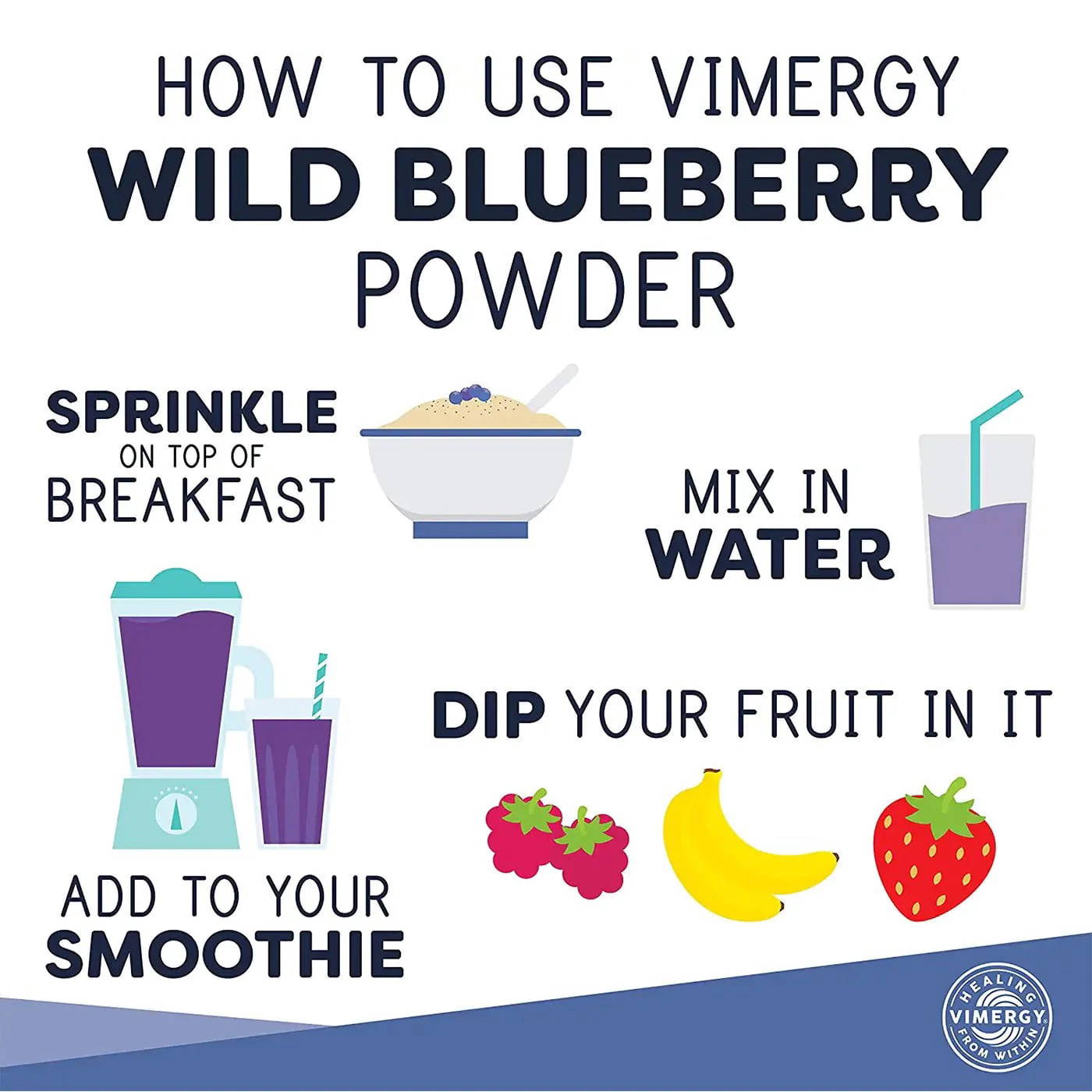 Vimergys blåbærpulver inneholder bare én ting; "lowbush" blåbær, høstet vilt i Newfoundland, Canada, i en region som har blant den reneste luften, reneste vannet og minst forurensning i verden.