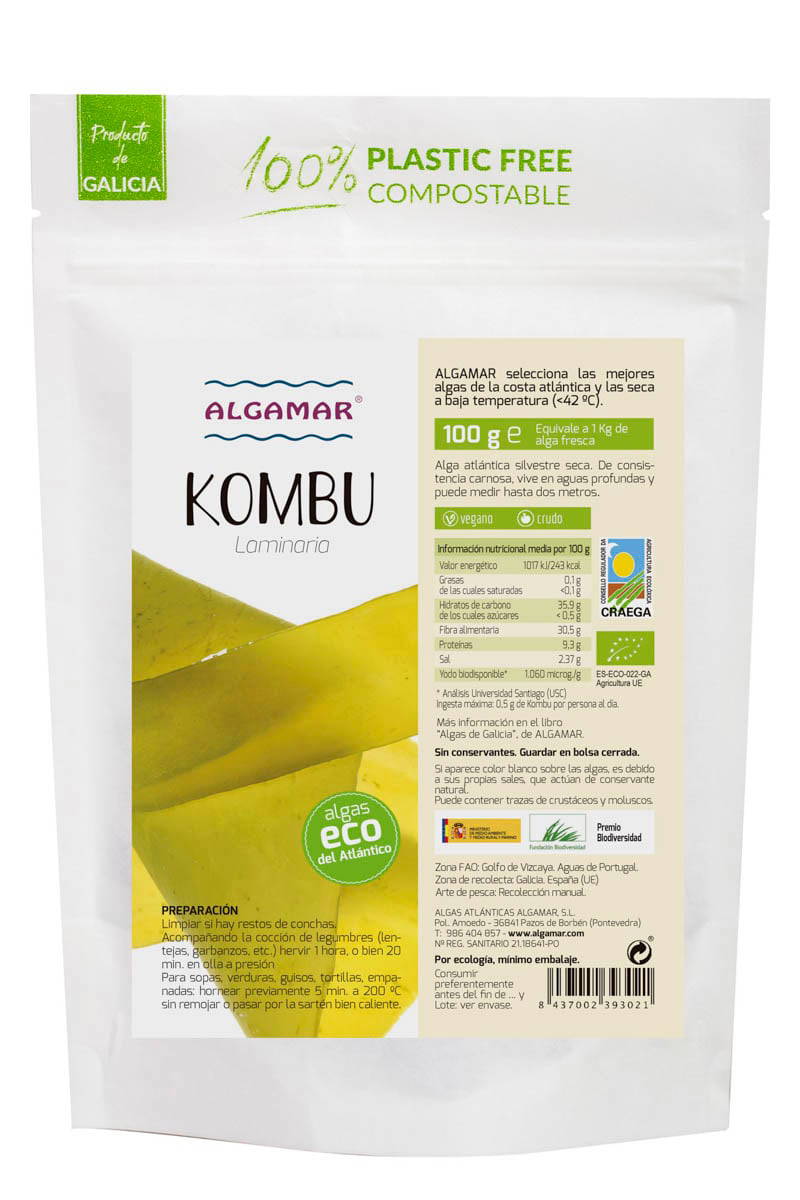 Ingredienser: Kombu (Laminaria). Algamar´s alger är vilda och skördas för hand i Atlantens renaste vatten och torkas vid låga temperaturer, <42 ° C, för att bevara det maximala näringsvärdet. 100 gram. A llergiinformation: På grund av produktens naturlighet kan den innehålla spår av blötdjur och / eller kräftdjur. Ska ej intas vid fisk och skaldjursallergi.