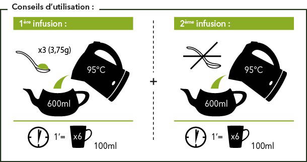 Beredning: Blanda ca 1 tsk i en stor kopp eller tre teskedar i en tekanna. Den idealiska temperaturen på vattnet är 95° C. Låt dra i ca 1 minut. Det håller till två bryggningar.
