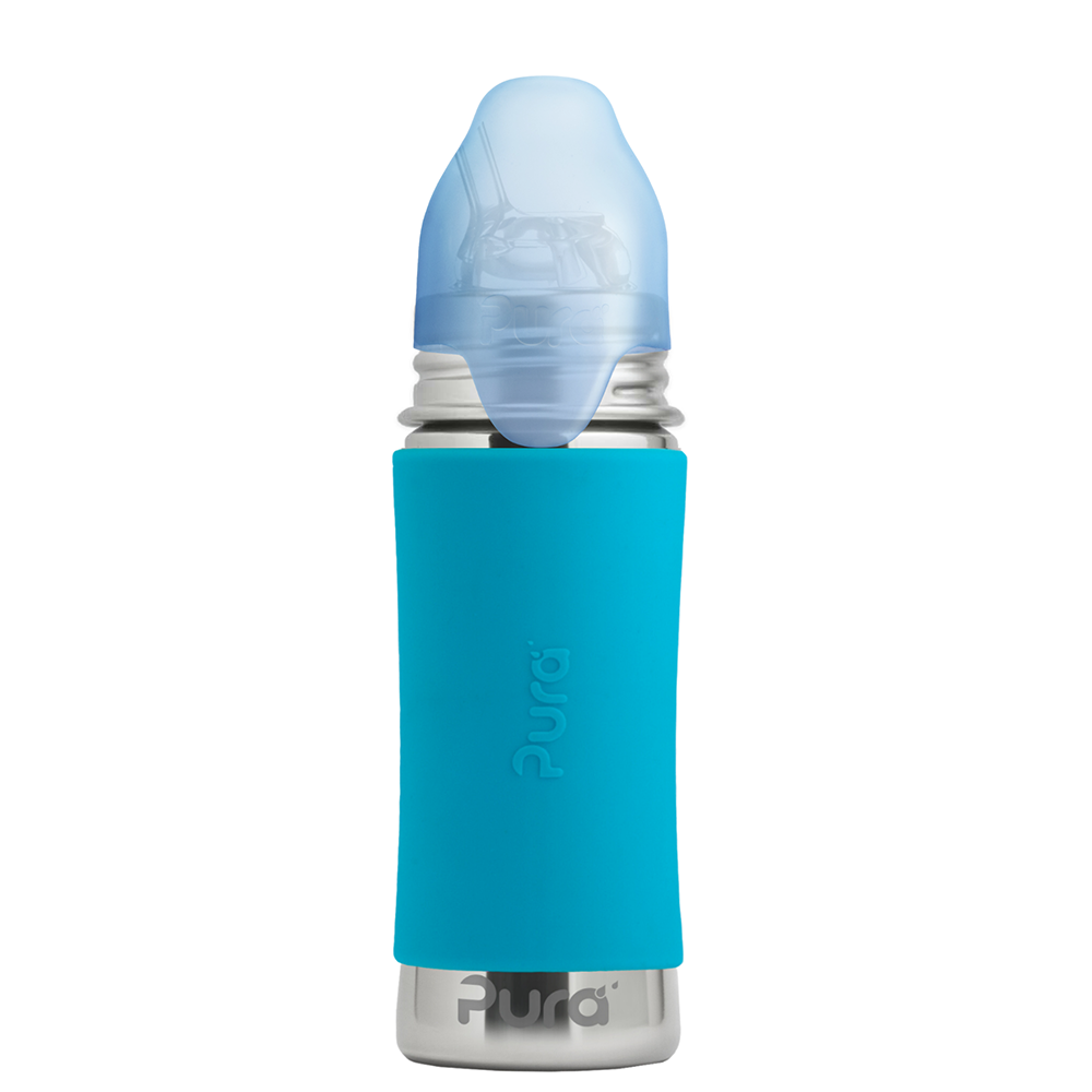 Puras sugrörsflaska i rostfritt stål är 100 % plastfri och helt fri från BPA, ftalater och bly. Flaskan är kompatibel med de flesta dinappar och går lätt att konvertera till en nappflaska, pipmugg eller sportflaska genom att köpa till en dinapp eller annan kork. Vattenflaskan har ett smart silikonhölje som ger ett bra grepp för små händer och som samtidigt hjälper till att skydda flaskan mot stötar.