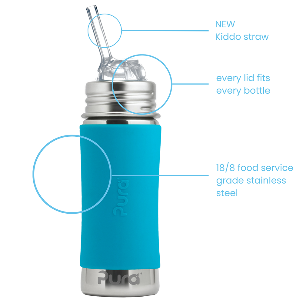 Pura - Kiddo Straw Bottle Rostfritt Stål med Silikonhölje 325 ml, Aqua