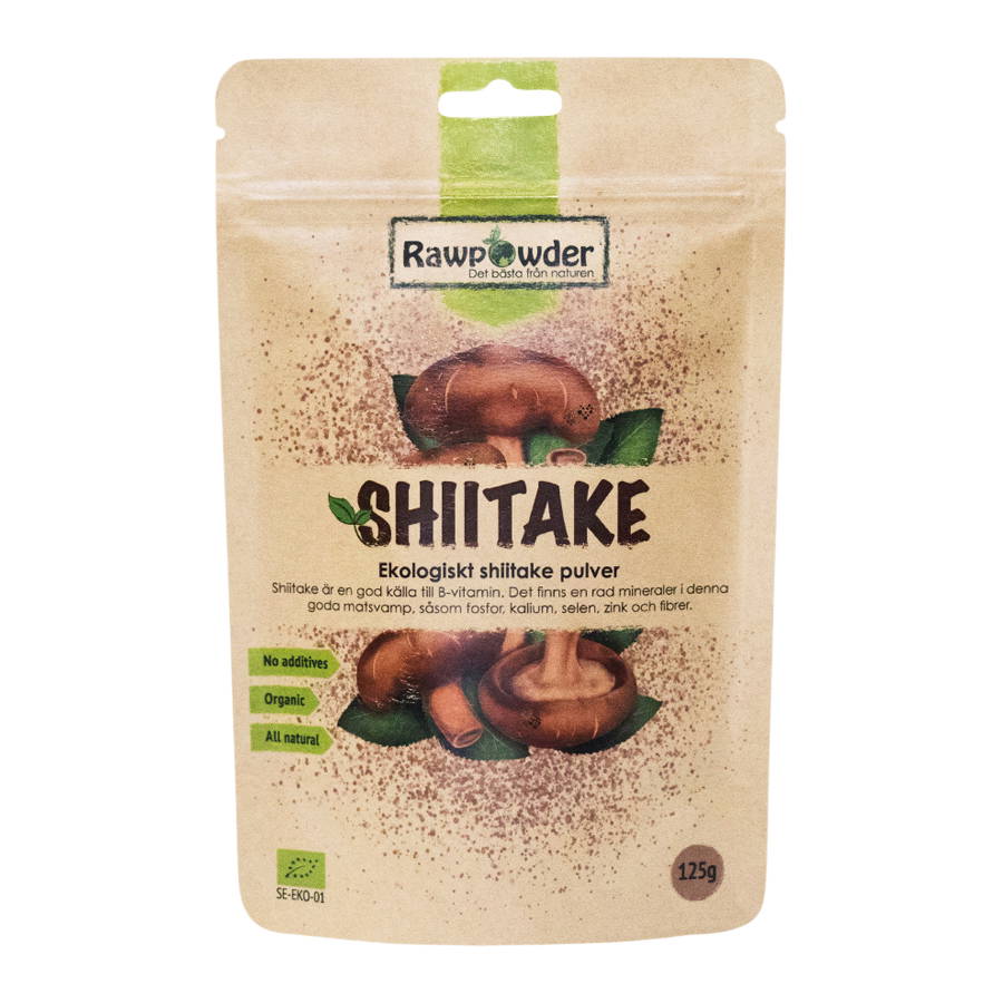 Shiitake är en smakrik svamp, ofta använd i det japanska köket och den näst mest odlade svampen i världen. Namnet kommer från det japanska ordet ”shii”, ett trädslag, och ”take” som betyder svamp. Rawpowders shiitakepulver är gjort av ekologiskt torkad shiitake, helt utan tillsatser.
