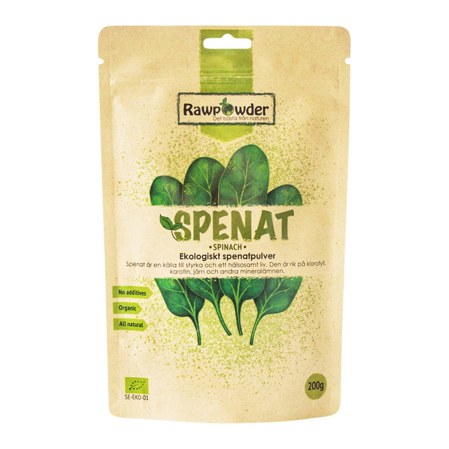 Praktiskt ekologiskt spenatpulver då det är svårt att hitta färsk spenat eller få i sig önskad mängd. Det tillverkas av torkade spenatblad och är fritt från tillsatser. Pulvret har en mild, nötig smak och passar utmärkt i allt från bröd, grytor och soppor, till smoothies och shakes.