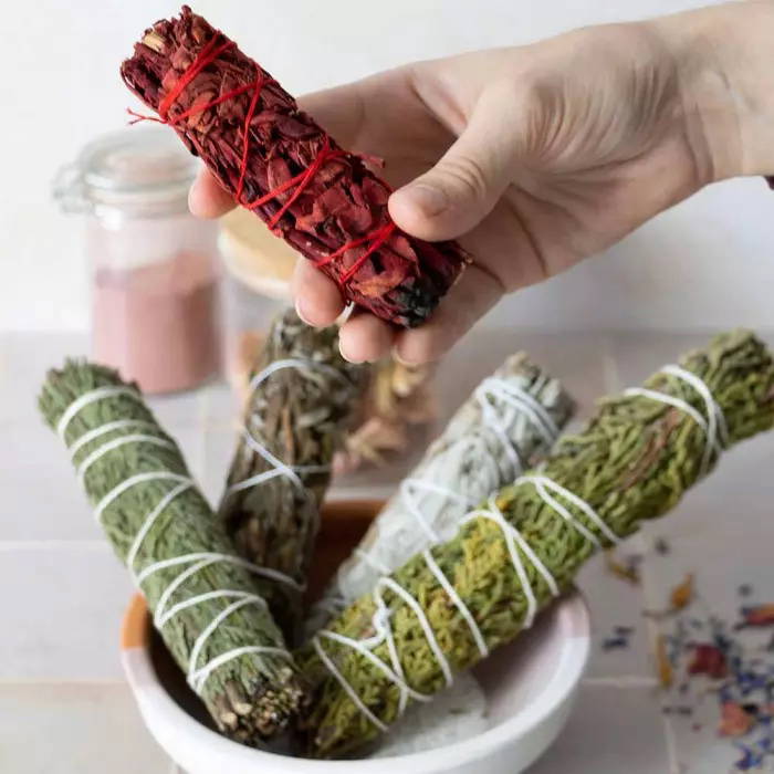 Tänd salvian i ena hörnet. Låt lågan ta sig och "blås" sedan ut den. Den ska ryka, inte brinna. Gå runt i varje rum i huset eller lägenheten och låt röken sprida sig. Släck i en värmetålig skål. Mycket dryg, går att använda om och om igen.