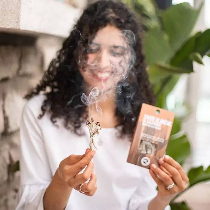 Kaliforniska salviakvistar antänds lätt. Låt lågan ta sig och "blås" sedan ut den med en vindpust från handen för att släcka den och låta kvistarna brinna på samma sätt som en rökelsepinne.